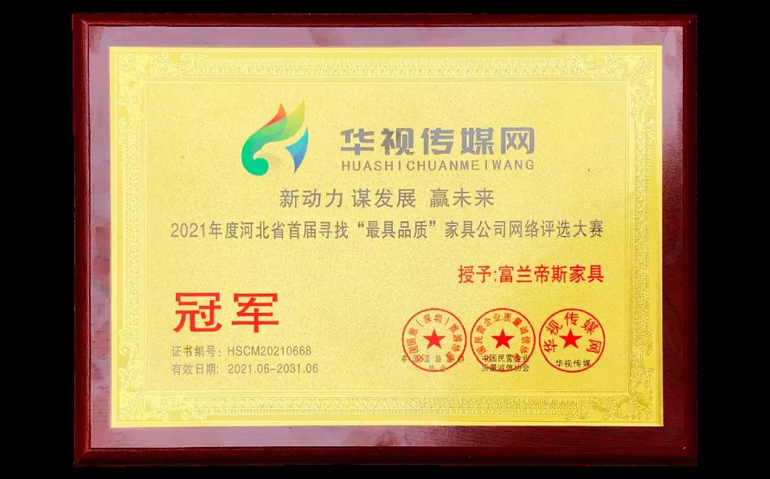 斩获此次2021年度河北省首届寻找“最具品质”家具公司网络评选大赛的冠军
