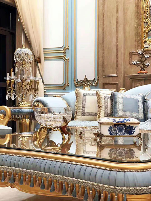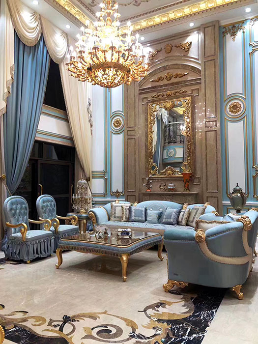 客厅以湛蓝色为主,尽显高贵、静谧、优雅的贵族气质。极具法式宫廷特色的护墙板与沙发的风格相互交融,将法式风情的飘逸柔美与富贵典雅演绎的淋淋尽致。湛蓝色的沙发,简约而不失单调,恰到好处的点缀尽显优雅与格调。颇具设计感的大方几与这个客厅的风格协调统一,复古又别具韵味。繁美的法式雕花,宫廷感十足的水晶吊灯再搭配奢华飘逸的窗帘,仿佛穿越了时光的隧道,来到了欧洲贵族的宫殿,梦幻、唯美,让人充满了无尽的想象。
