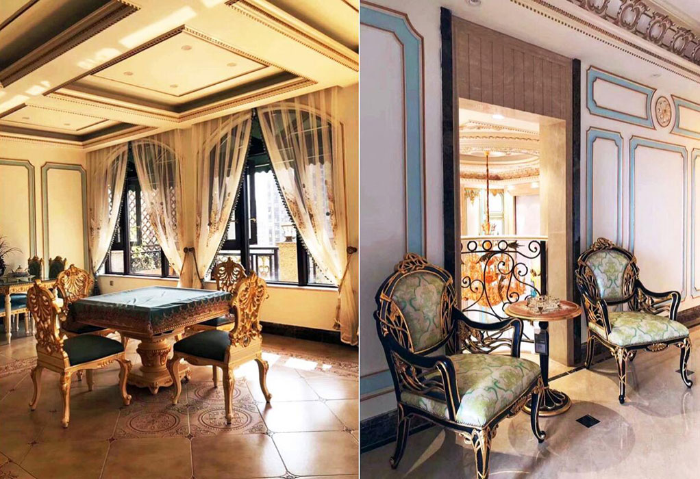 整个休闲区的设计展现了惬意悠闲的贵族生活,通透敞亮的飘窗设计,极具梦幻的纱窗点缀,让整个空间透亮明媚,在阳光的映射下慵懒而舒适,有种岁月静好的恬静。带着点欧式贵族元素设计的麻将桌,与精美镂空雕花设计的椅子展现了主人精致入骨的生活态度与奢华高贵的生活品味。聊天角的设计则充满了一派优雅的格调,极具欧式特色的花纹元素搭配质感高级的黑金单椅,与小圆几的搭配让人静享美好时光。闲来时,或约上好友,或与家人闲谈嬉戏生活别有一番情趣。