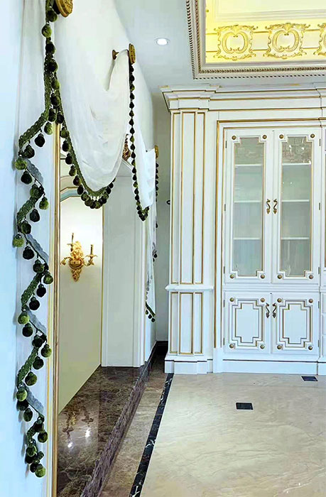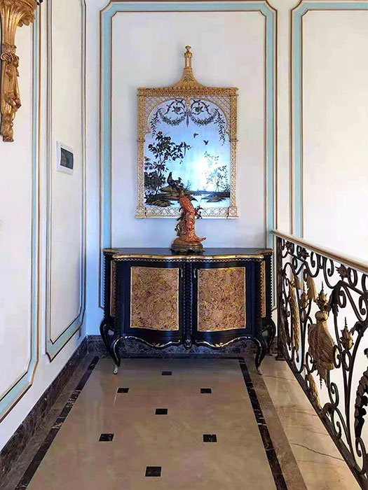 复古感满满的欧式走廊,大面积的蓝白镶嵌式护墙板,恰到好处的点缀以及精美的雕刻描金工艺的运用,提升了整体空间的艺术感。极具历史感的厅柜,彰显了厚重的文化底蕴。一幅极具古典韵味的壁画厅柜的风格相互融合,一股典雅而庄重的岁月情怀迎面而来。