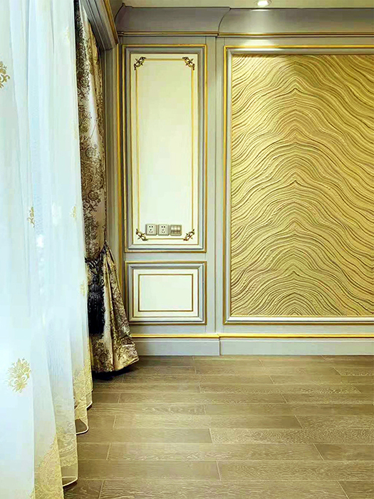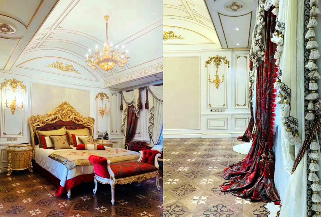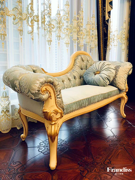 整个卧室的风格沿用了法国凡尔赛宫的设计风格,回旋曲折的曲线,纷繁细腻的流苏印花,精细千巧的雕刻,每一处细节都将欧式古典轻盈纤细的秀美演绎到了极致。卧室护墙板的设计决定了整个空间的格调,高贵优雅,浪漫唯美让人仿佛置身于女王的宫殿,米白色的墙面上雕刻着精美的图案,用精细的描金做点缀,彰显了皇室贵族的尊贵与奢华。
