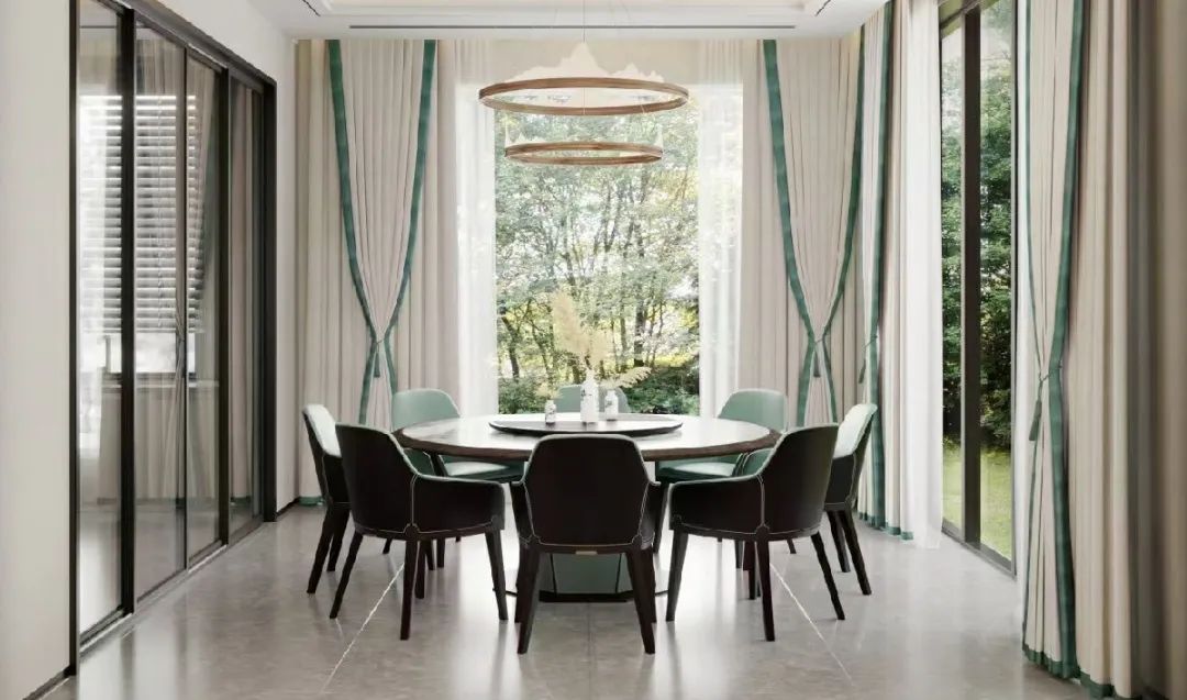 整个餐厅的设计延续的客厅的风格,注重空间的布局营造了灵动、通透质感。环抱式靠背设计的湖水绿餐椅皮质柔软细腻,坐感舒适再配搭青山绿水纹理的大理石圆餐台,清新素雅。