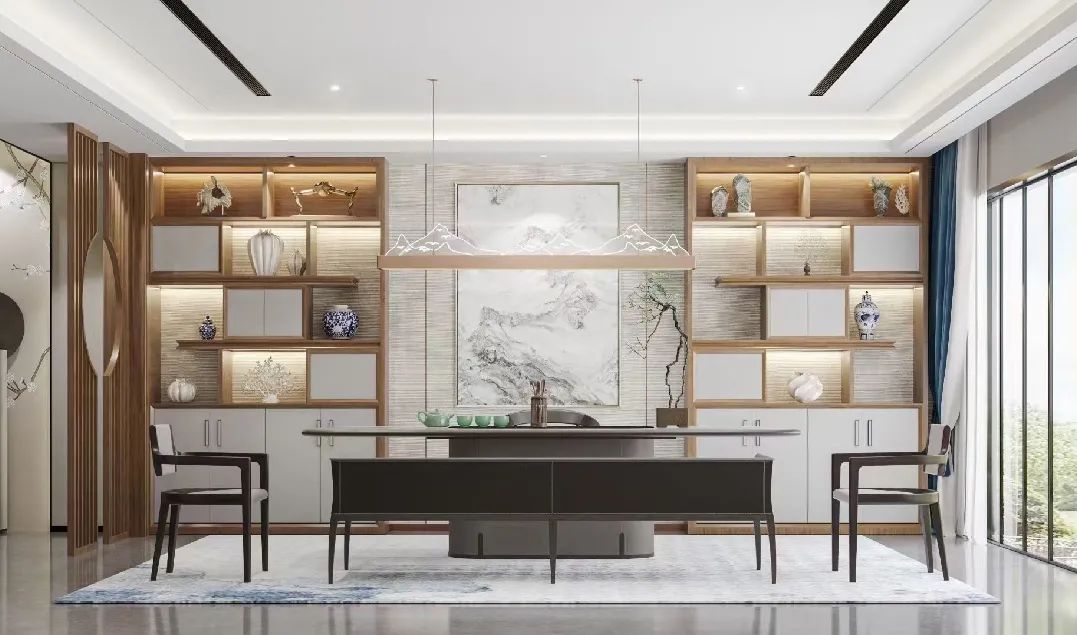 茶室的设计不仅限于品茶,更是一个静心,放松的空间。这里既可以承担社交的功能,又可以一人独处,修养身心。本案的茶室设计展现了现代简约的茶室之美。用至简,淡雅的色彩,洗练的线条,再加一方清新雅致的茶台,不仅营造了空间的意境,还能在茶香袅袅的不断升腾中,得到一种味觉之外的欢愉和满足。