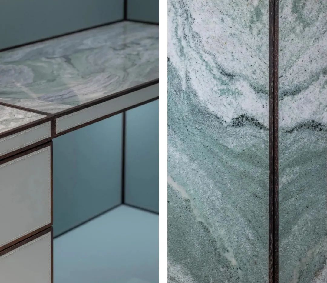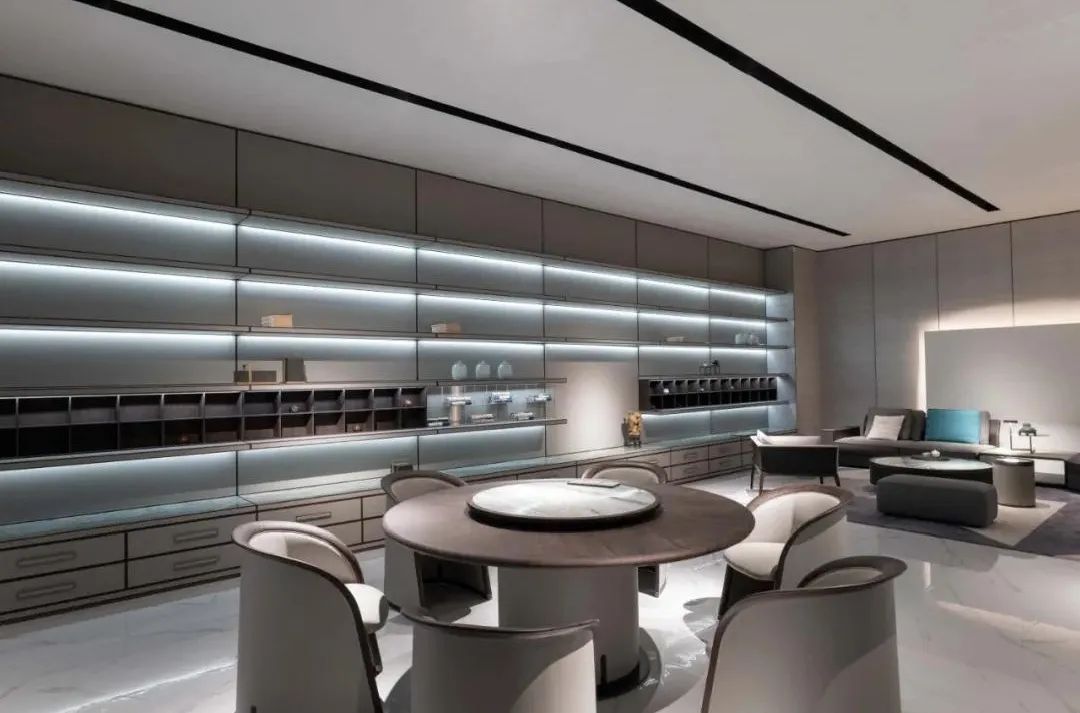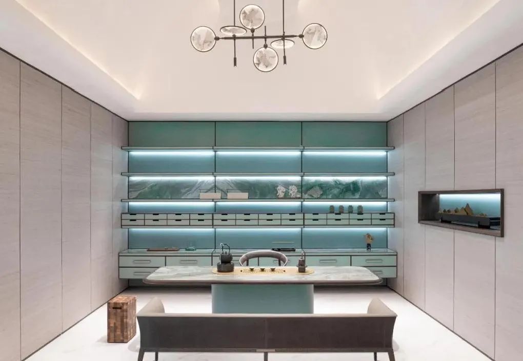 茶室中水墨纹理的大理石台面与进口木材无缝贴合,自带高级感;靠墙的大体量收纳柜体巧妙运用木材、皮革、大理石三种材质进行搭配,过渡自然,并呈现干净利落的线条美感;组合式沙发与木质茶几的格局摆布凸出空间层次感,柔和的外在轮廓不失温暖属性。