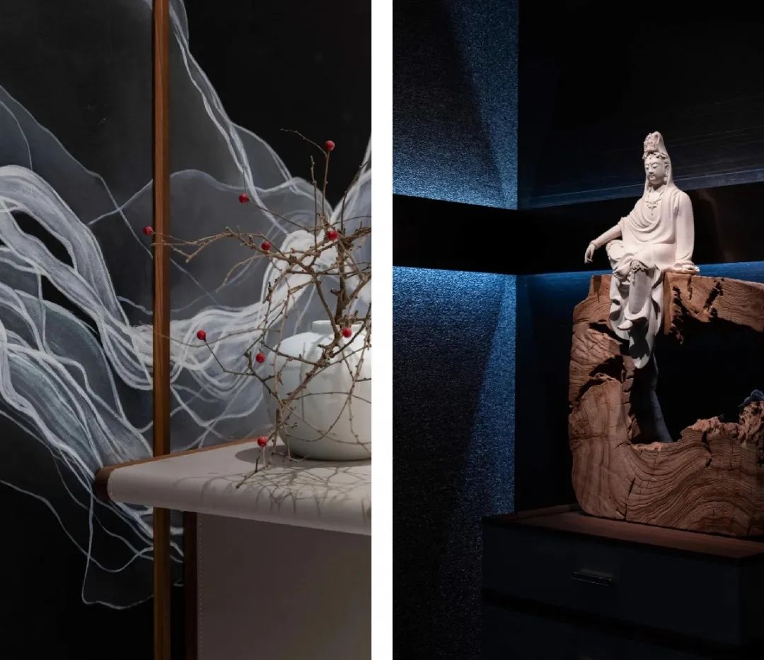 茶具、佛像、花瓶、灯饰等物件的精巧摆置更是为空间注入了禅思,提升整体格调,动静分离的场景布局细腻流转,勾勒出“型有尽、意无穷”的人文居所,富兰帝斯以开放式的设计思维诠释了不一样的东方美学。